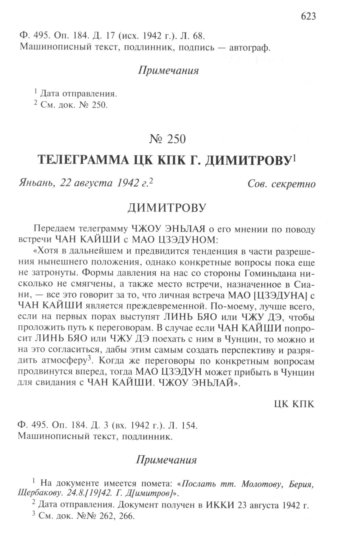 Телеграмма ЦК КПК Г. Димитрову. Яньань, 22 августа 1942 г. // РГАСПИ. Ф. 495. Оп. 184. Д. 3 (вх. 1942 г.). Л. 154. Машинописный текст, подлинник.