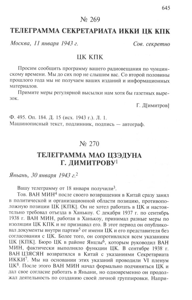 Телеграмма Мао Цзэдуна Г. Димитрову. Яньань, 30 января 1943 г. // РГАСПИ. Ф. 495. Оп. 184. Д. 9 (вх. 1943 г.). Л. 10-13. Машинописный текст, подлинник.