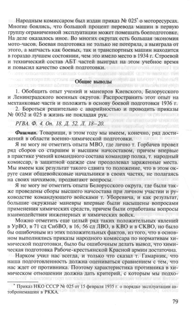 Стенограмма заседания Военного совета при народном комиссаре обороны СССР 8—14 декабря 1935 г. Доклады и выступления по итогам боевой подготовки РККА за 1935 г. и задачи на 1936 г. Стенограмма утреннего заседания 8 декабря 1935 г. Фишман Я.М. // РГВА. Ф. 4. Оп. 18. Д. 52. Л. 20-21.