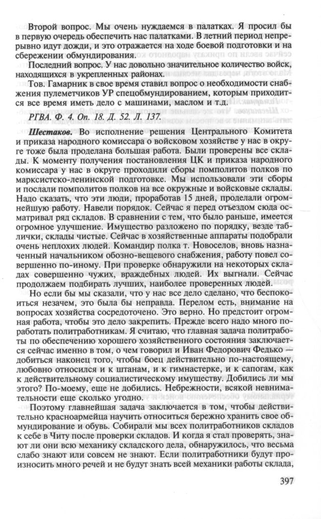 Стенограмма заседания Военного совета при народном комиссаре обороны СССР 8—14 декабря 1935 г. Доклад и выступление об обозно-вещевом снабжении РККА. Стенограмма вечернего заседания 11 декабря 1935 г. Шестаков В.Н. // РГВА. Ф. 4. Оп. 18. Д. 52. Л. 137.