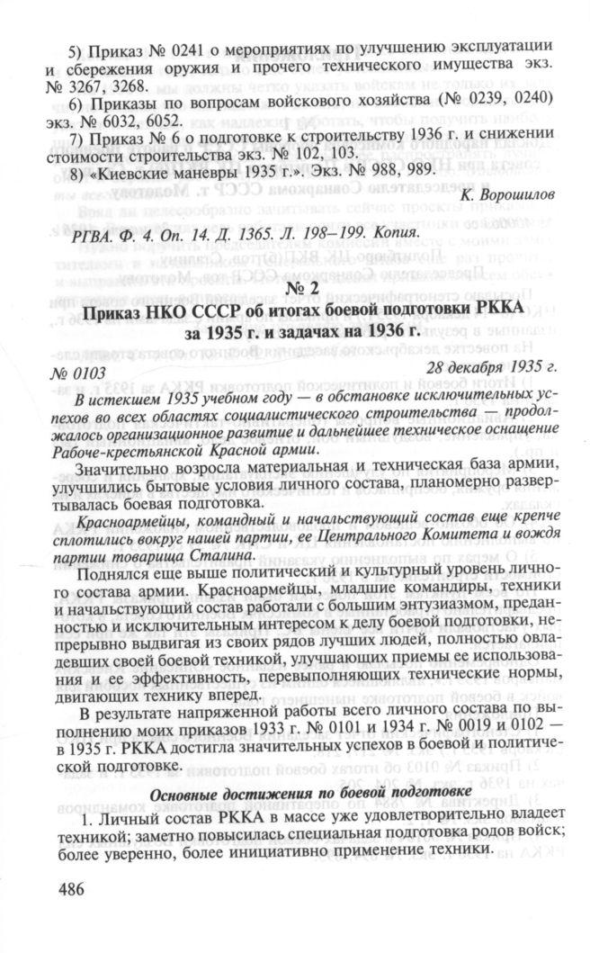 Приказ НКО СССР об итогах боевой подготовки за 1935 г. и задачах на 1936 г. № 0103. 28 декабря 1935 г. // РГВА. Ф. 4. Оп. 15а. Д. 406. Л. 53-63а. Типографский экземпляр.