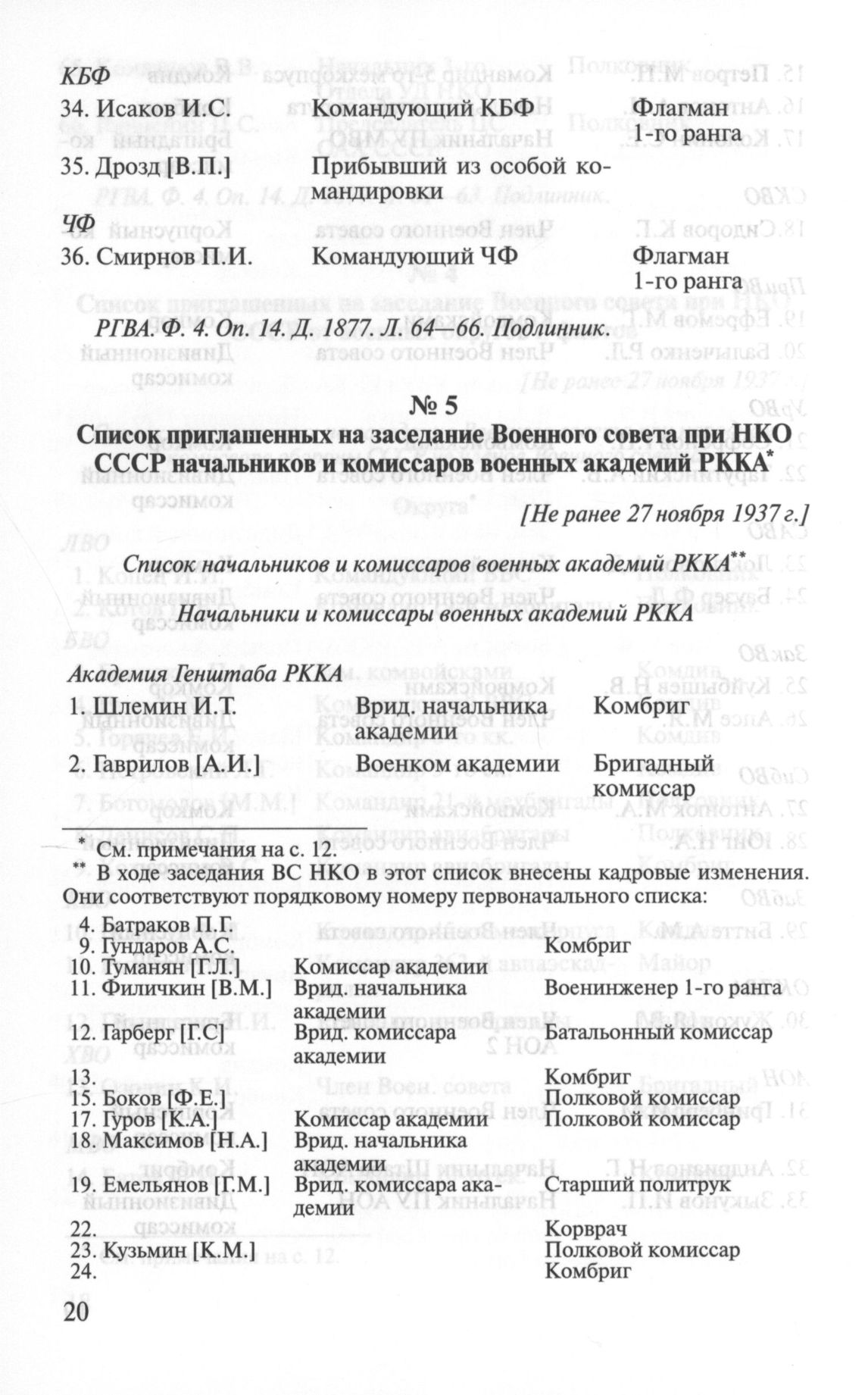 Список приглашенных на заседание Военного совета при НКО СССР начальников и комиссаров военных академий РККА. [Не ранее 27 ноября 1937 г.] // РГВА. Ф. 4. Оп. 14. Д. 1877. Л. 67—68. Подлинник.