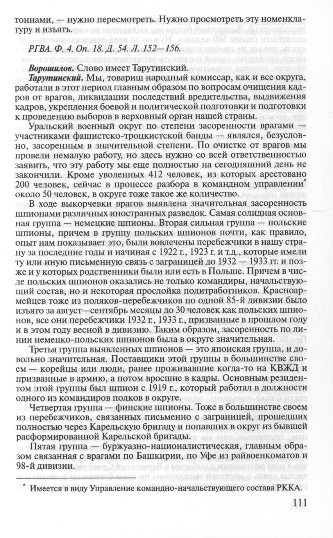 Стенограмма докладов и выступлений участников заседания Военного совета при НКО СССР. 21—23 ноября 1937 г. Утреннее заседание 22 ноября 1937 г. Тарутинский А.В. // РГВА. Ф. 4. Оп. 18. Д. 54. Л. 157-160.