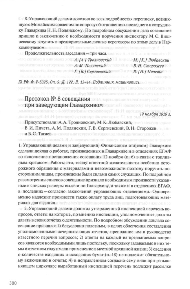 Протокол № 8 совещания при заведующем Главархивом. 19 ноября 1919 г.