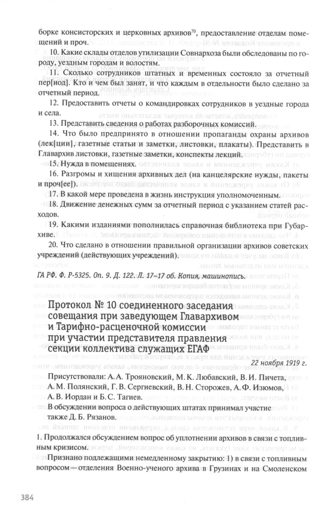 Протокол № 10 соединенного заседания совещания при заведующем Главархивом и Тарифно-расценочной комиссии при участии представителя правления секции коллектива служащих ЕГАФ. 22 ноября 1919 г. // ГА РФ. Ф. P-5325. Oп. 9. Д. 122. Л. 19-20. Подлинник, машинопись.