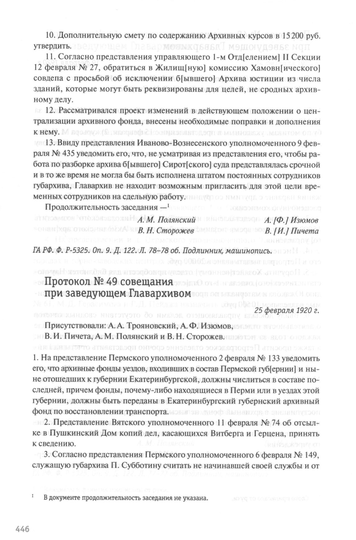 Протокол № 49 совещания при заведующем Главархивом. 25 февраля 1920 г. // ГА РФ. Ф. P-5325. Oп. 9. Д. 122. Л. 79-79 об. Подлинник, машинопись.