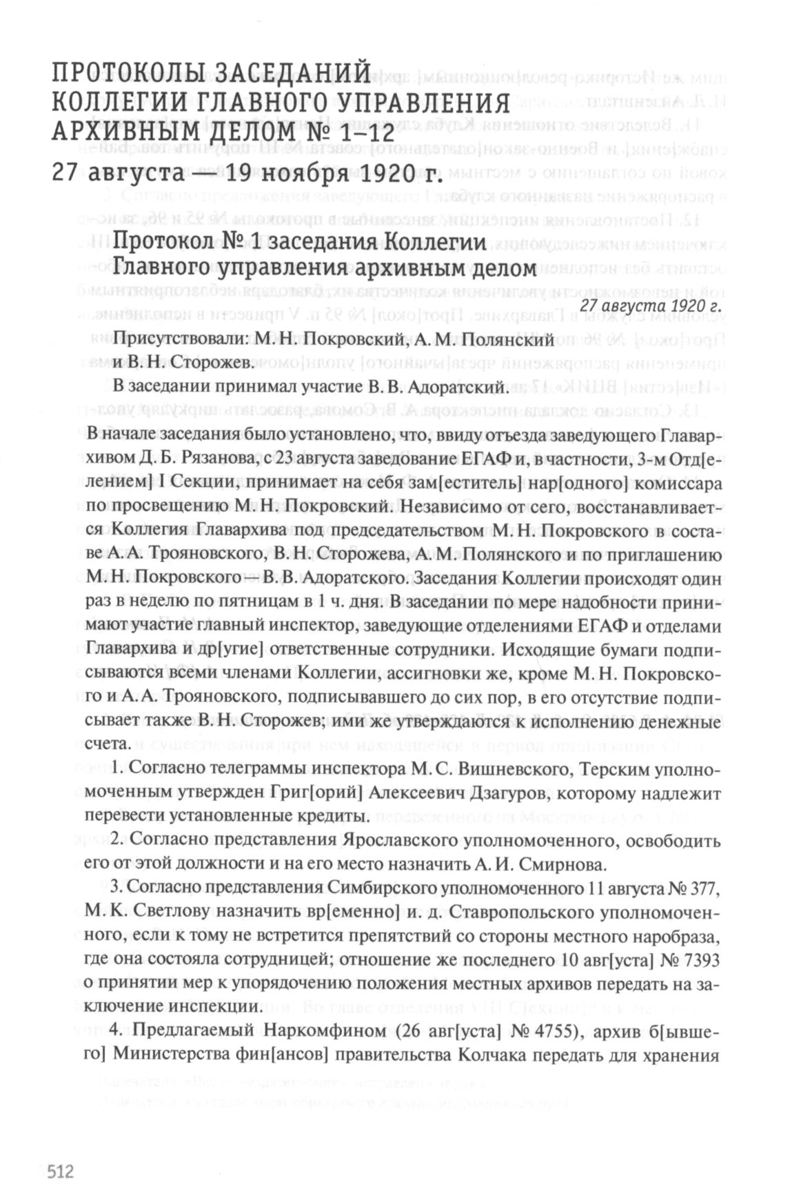 Протокол № 1 заседания Коллегии Главного управления архивным делом. 27 августа 1920 г. // ГА РФ. Ф. P-5325. Oп. 9. Д. 209. Л. 1-1 об. Подлинник, машинопись.