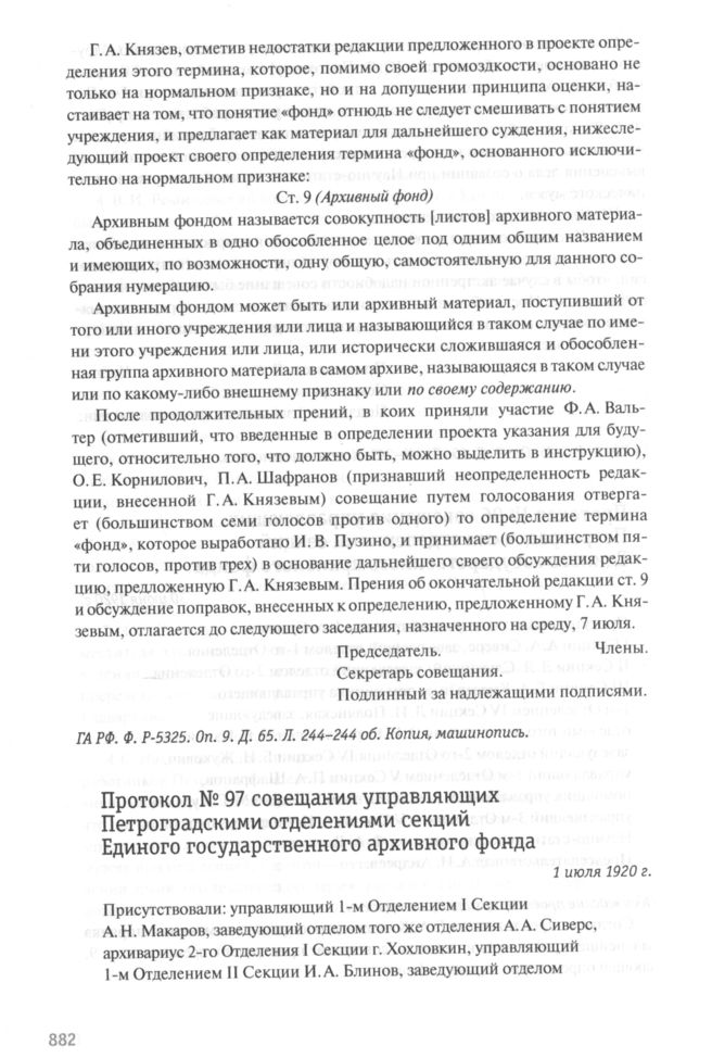 Протокол № 97 совещания управляющих Петроградскими отделениями секций Единого государственного архивного фонда. 1 июля 1920 г. // ГА РФ. Ф. P-5325. Oп. 9. Д. 65. Л. 245-246. Копия, машинопись.