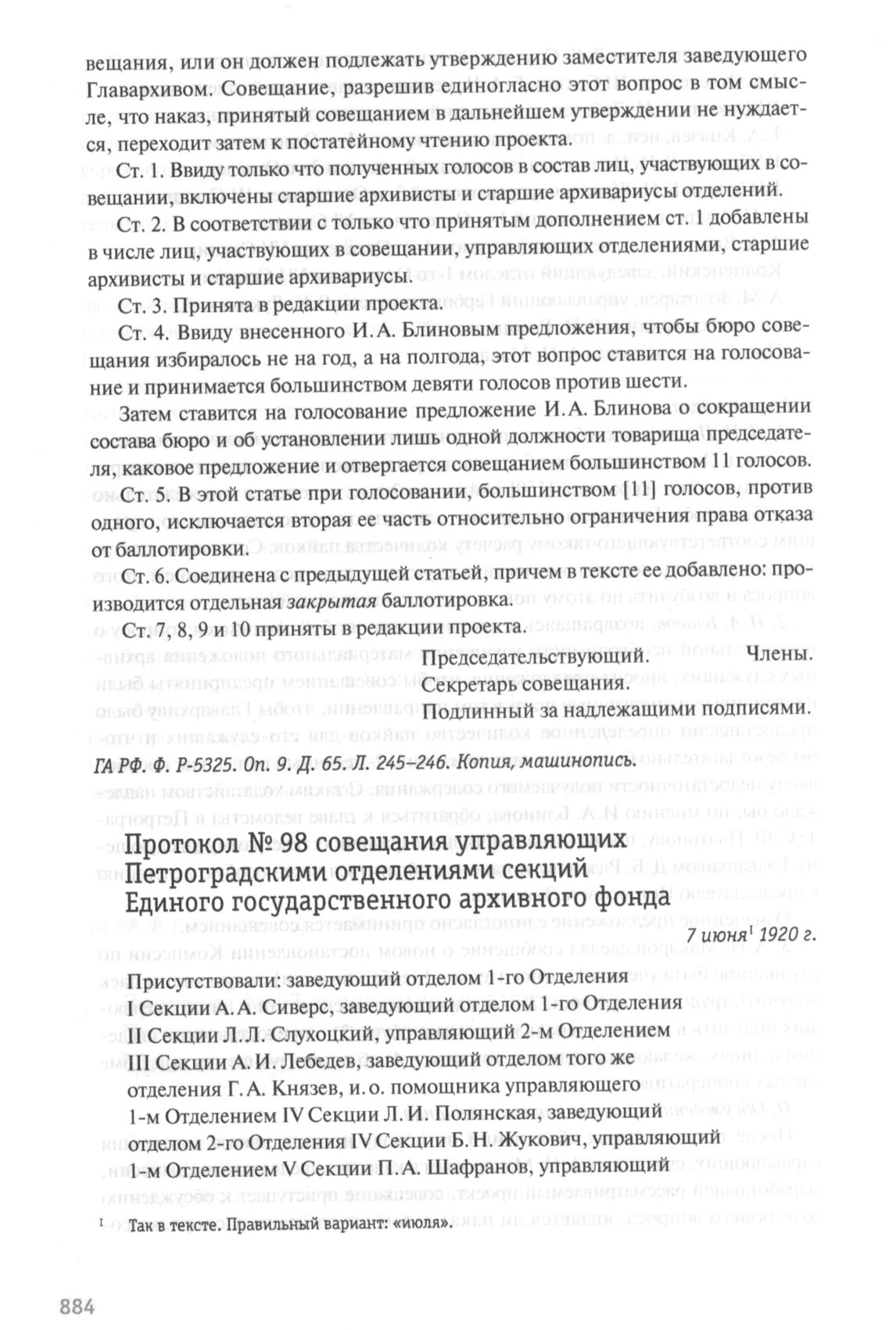 Протокол № 98 совещания управляющих Петроградскими отделениями секций Единого государственного архивного фонда. 7 июня 1920 г. // ГА РФ. Ф. P-5325. Oп. 9. Д. 65. Л. 247-248. Копия, машинопись.