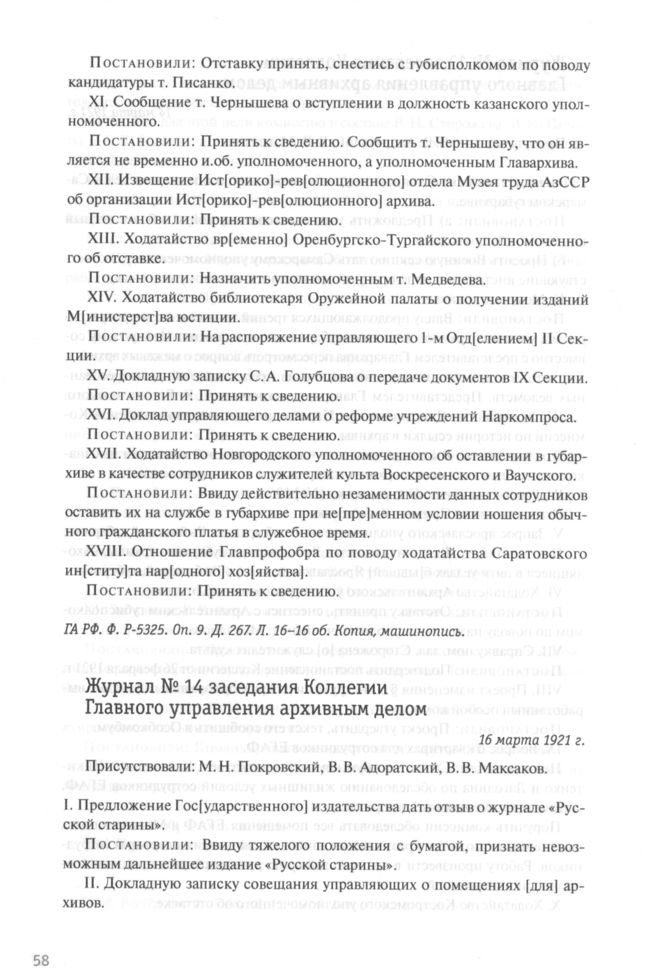 Журнал № 14 заседания Коллегии Главного управления архивным делом. 16 марта 1921 г. // ГА РФ. Ф. P-5325. Oп. 9. Д. 267. Л. 17. Копия, машинопись.