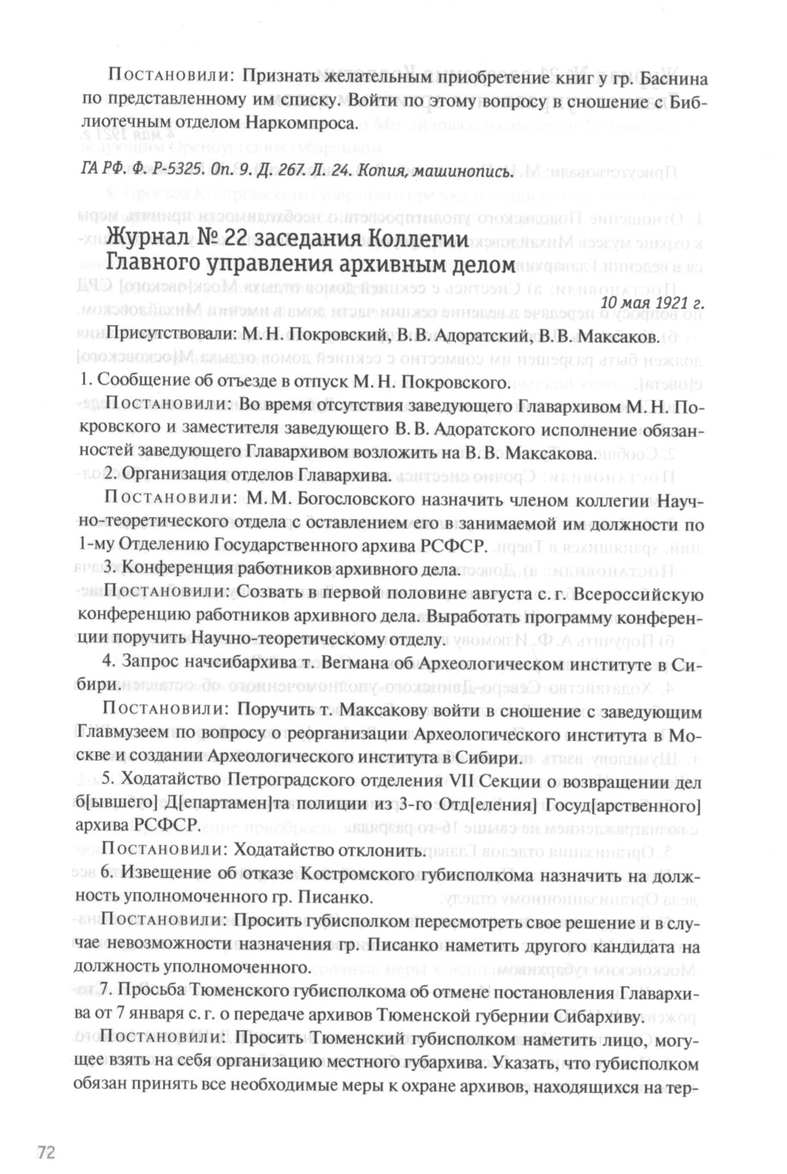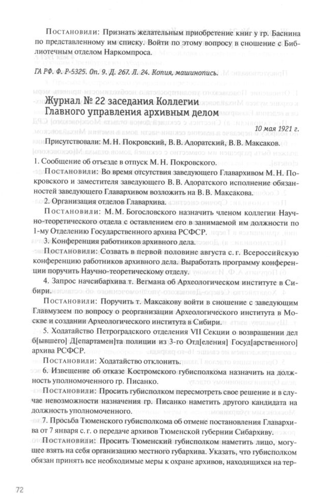 Журнал № 22 заседания Коллегии Главного управления архивным делом. 10 мая 1921 г. // ГА РФ. Ф. P-5325. Oп. 9. Д. 267. Л. 25-25 об. Копия, машинопись.