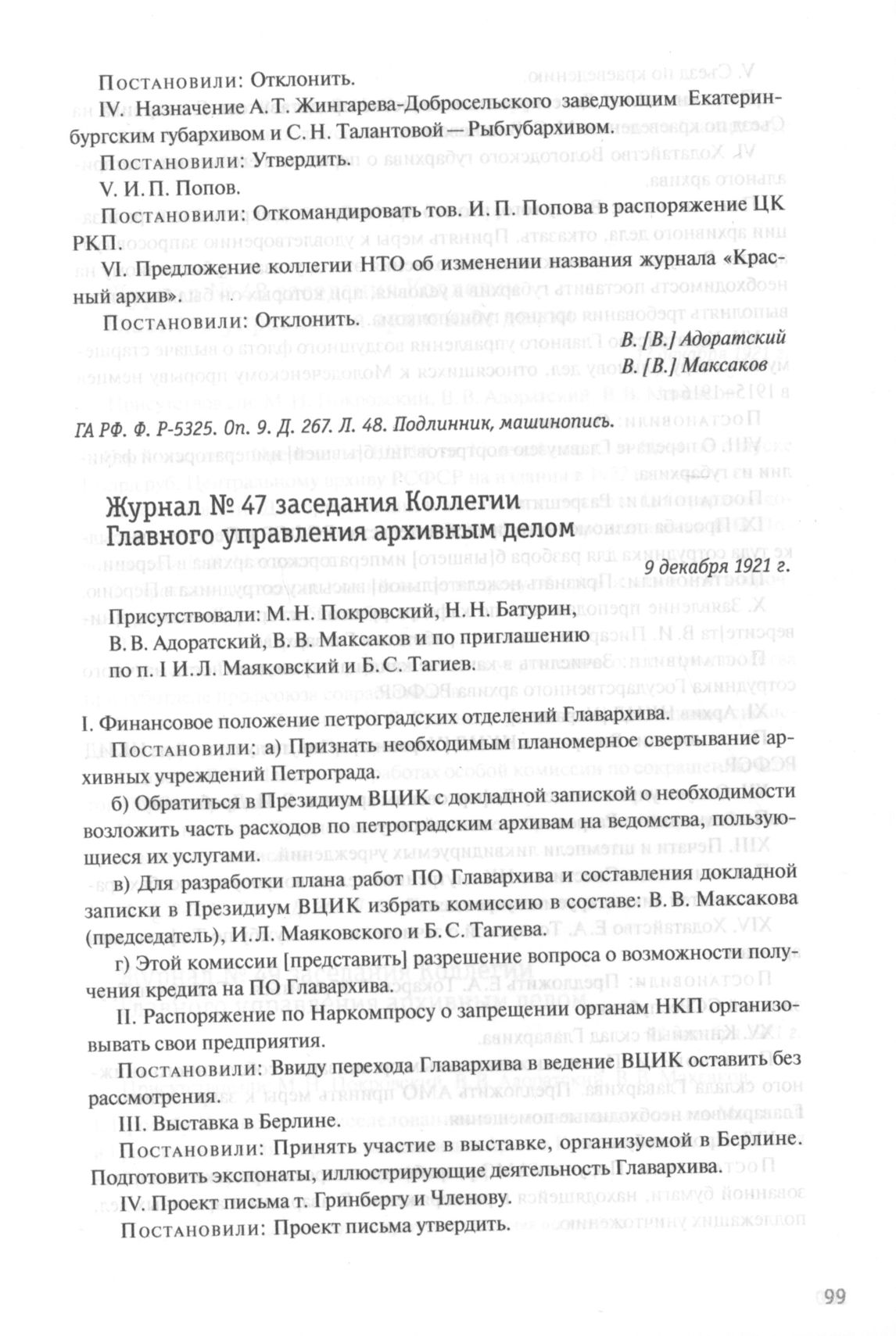 Журнал № 47 заседания Коллегии Главного управления архивным делом. 9 декабря 1921 г.