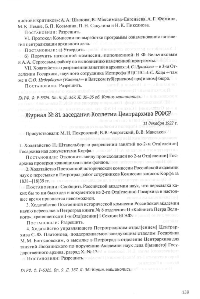 Журнал № 81 заседания Коллегии Центрархива РСФСР. 11 декабря 1922 г. // ГА РФ. Ф. P-5325. Oп. 9. Д. 367. Л. 36. Копия, машинопись.