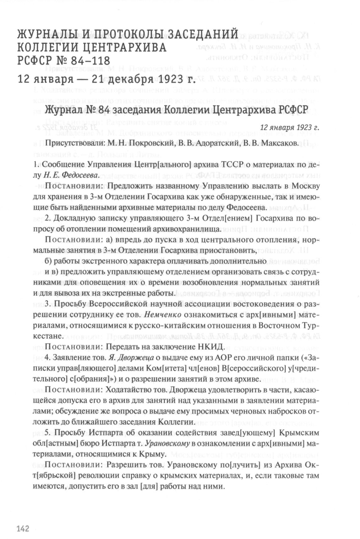 Журнал № 84 заседания Коллегии Центрархива РСФСР. 12 января 1923 г. // ГА РФ. Ф. P-5325. Oп. 9. Д. 367. Л. 39-39 об. Копия, машинопись.