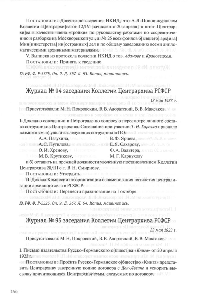Журнал № 94 заседания Коллегии Центрархива РСФСР. 12 мая 1923 г. // ГА РФ. Ф. P-5325. Oп. 9. Д. 367. Л. 54. Копия, машинопись.