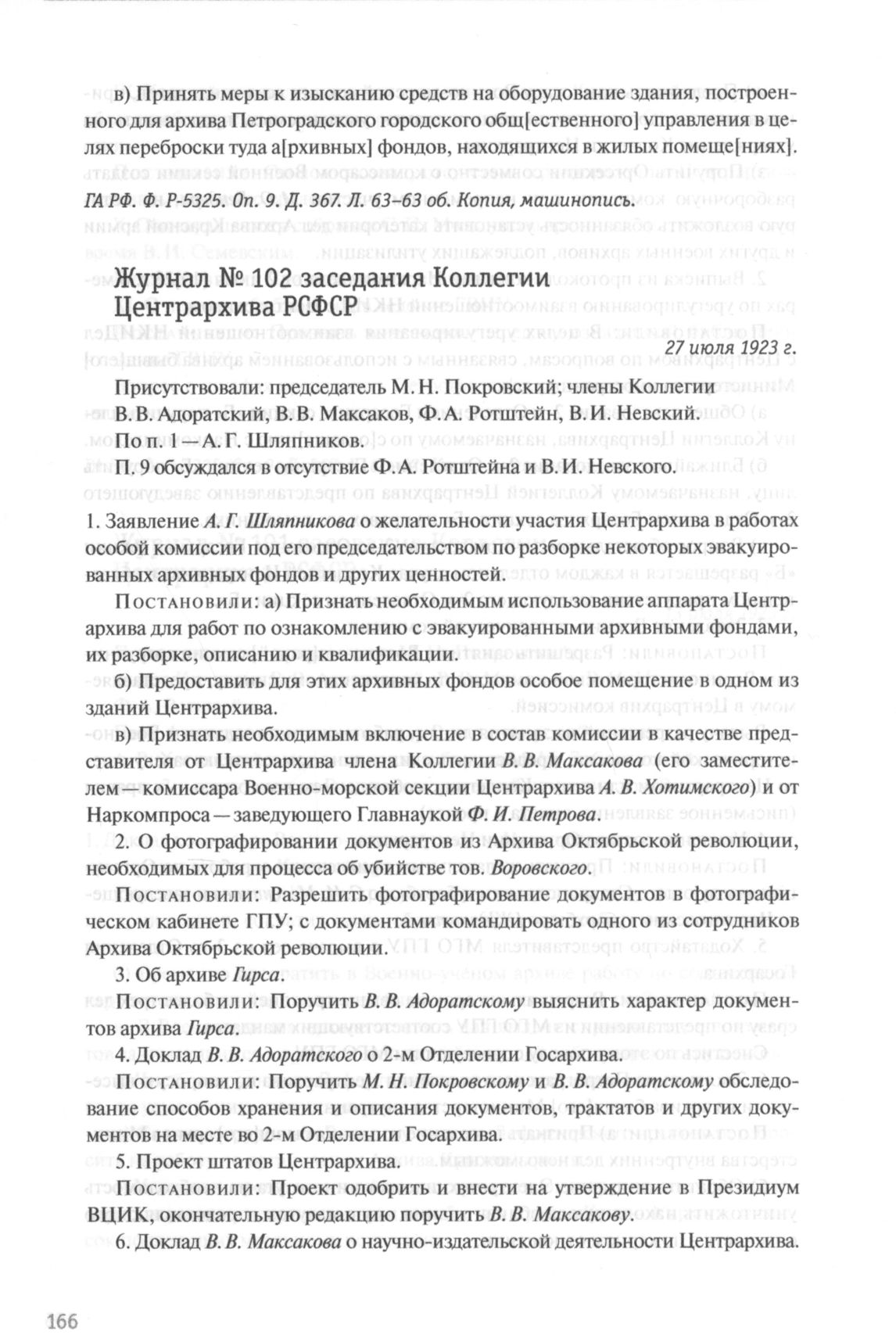 Журнал № 102 заседания Коллегии Центрархива РСФСР. 27 июля 1923 г. // ГА РФ. Ф. P-5325. Oп. 9. Д. 367. Л. 64-64 об. Копия, машинопись.