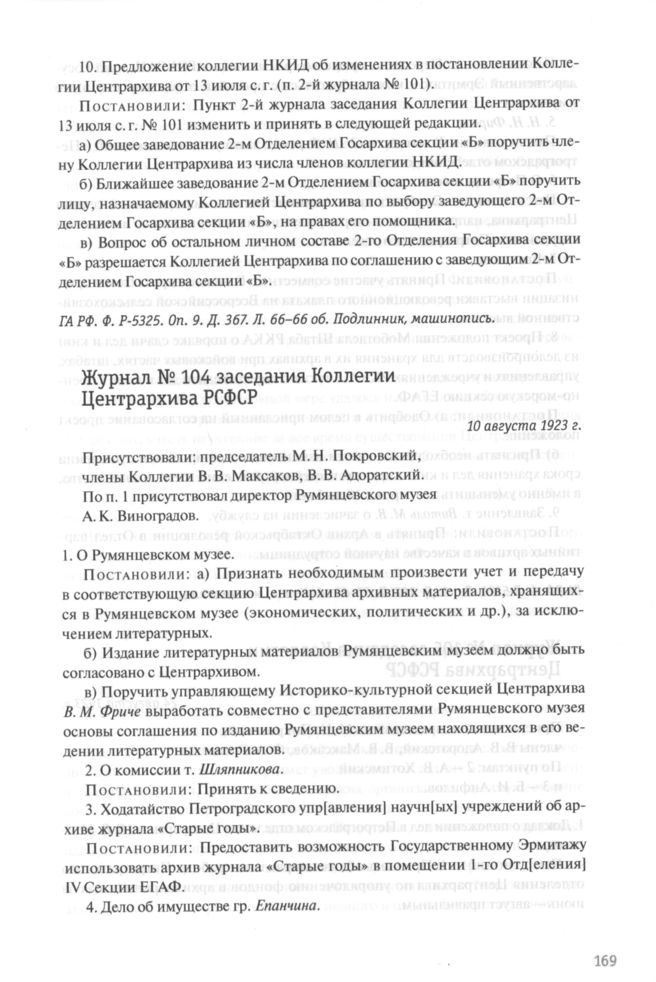 Журнал № 104 заседания Коллегии Центрархива РСФСР. 10 августа 1923 г. // ГА РФ. Ф. P-5325. Oп. 9. Д. 367. Л. 67-67 об. Копия, машинопись.