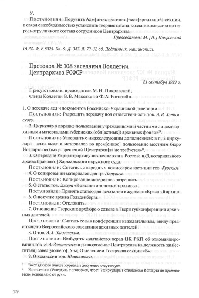 Протокол № 108 заседания Коллегии Центрархива РСФСР. 21 сентября 1923 г. // ГА РФ. Ф. P-5325. Oп. 9. Д. 367. Л. 73. Подлинник, машинопись.