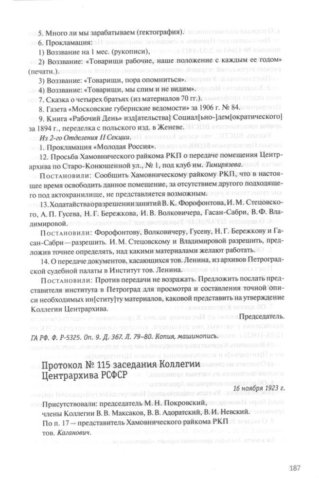 Протокол № 115 заседания Коллегии Центрархива РСФСР. 16 ноября 1923 г. // ГА РФ. Ф. P-5325. Oп. 9. Д. 367. Л. 81-82. Копия, машинопись.