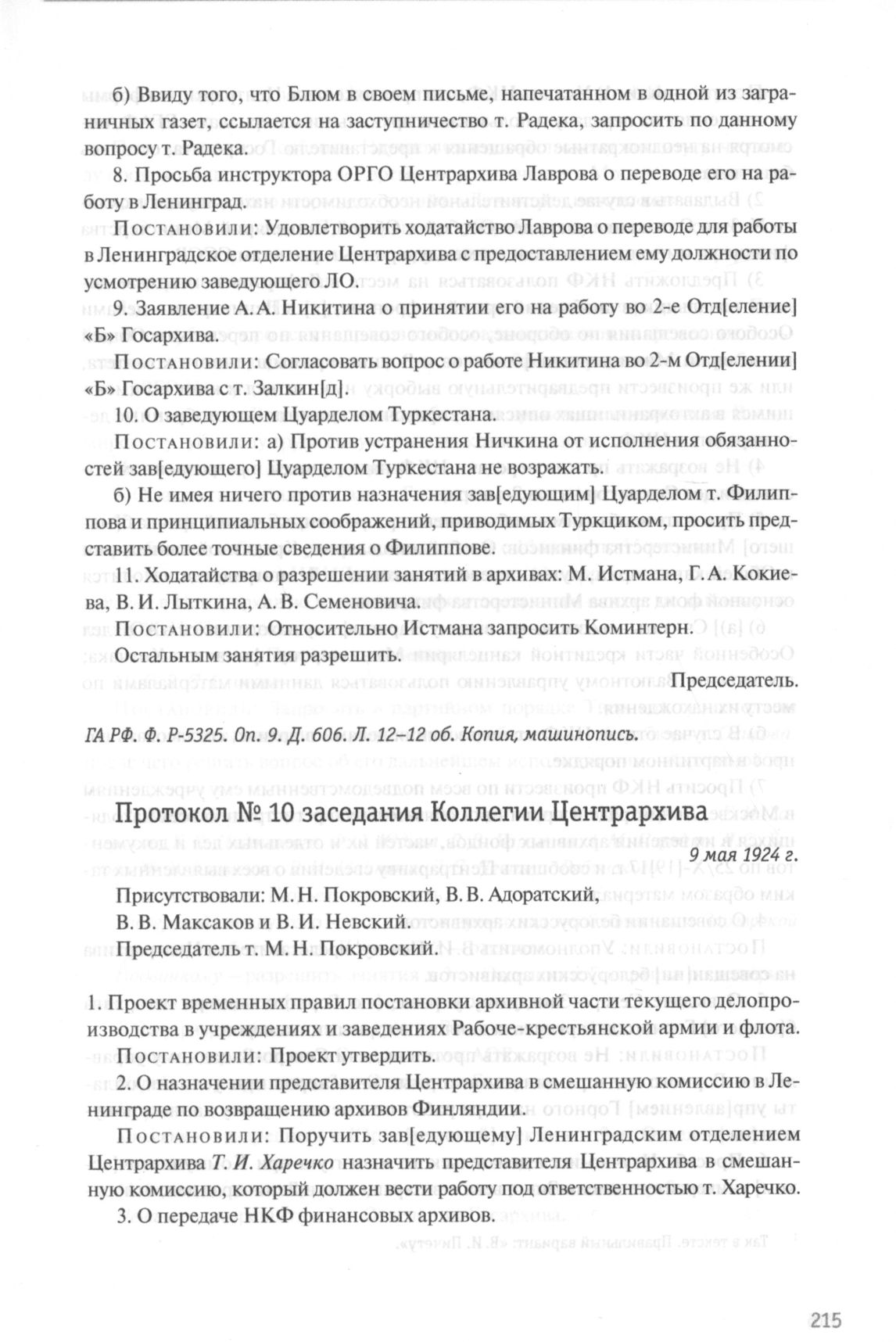 Протокол № 10 заседания Коллегии Центрархива РСФСР. 9 мая 1924 г. // ГА РФ. Ф. P-5325. Oп. 9. Д. 606. Л. 13-14. Подлинник, машинопись.