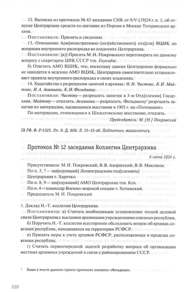Протокол № 12 заседания Коллегии Центрархива РСФСР. 6 июня 1924 г. // ГА РФ. Ф. P-5325. Oп. 9. Д. 606. Л. 16-16 об. Подлинник, машинопись.