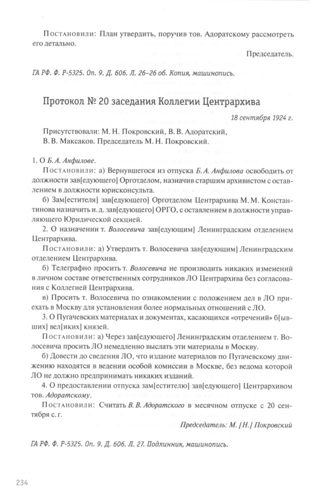 Протокол № 20 заседания Коллегии Центрархива РСФСР. 18 сентября 1924 г. // ГА РФ. Ф. P-5325. Oп. 9. Д. 606. Л. 27. Подлинник, машинопись.