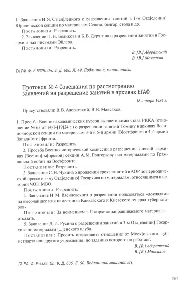 Протокол № 4 Совещания по рассмотрению заявлений на разрешение занятий в архивах ЕГАФ. 18 января 1924 г. // ГА РФ. Ф. P-5325. Oп. 9. Д. 606. Л. 50. Подлинник, машинопись.