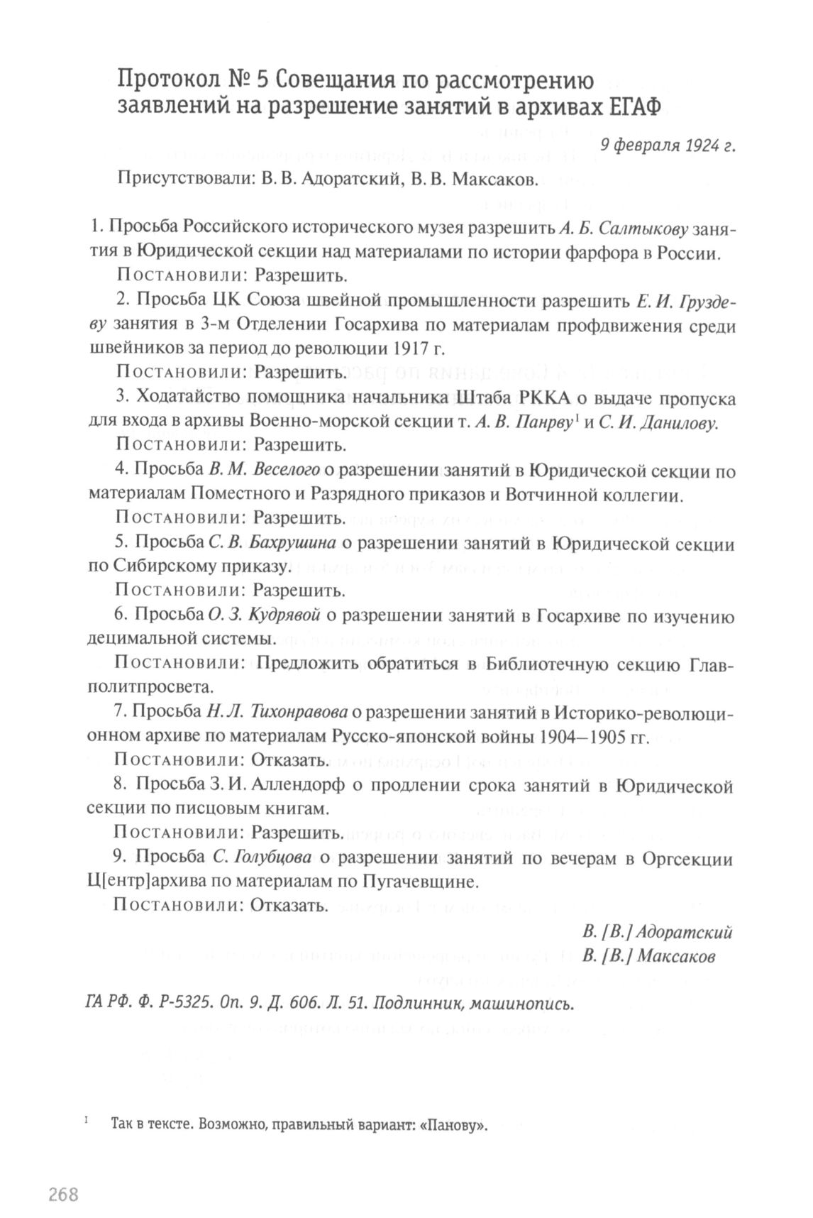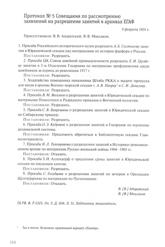 Протокол № 5 Совещания по рассмотрению заявлений на разрешение занятий в архивах ЕГАФ. 9 февраля 1924 г. // ГА РФ. Ф. P-5325. Oп. 9. Д. 606. Л. 51. Подлинник, машинопись.