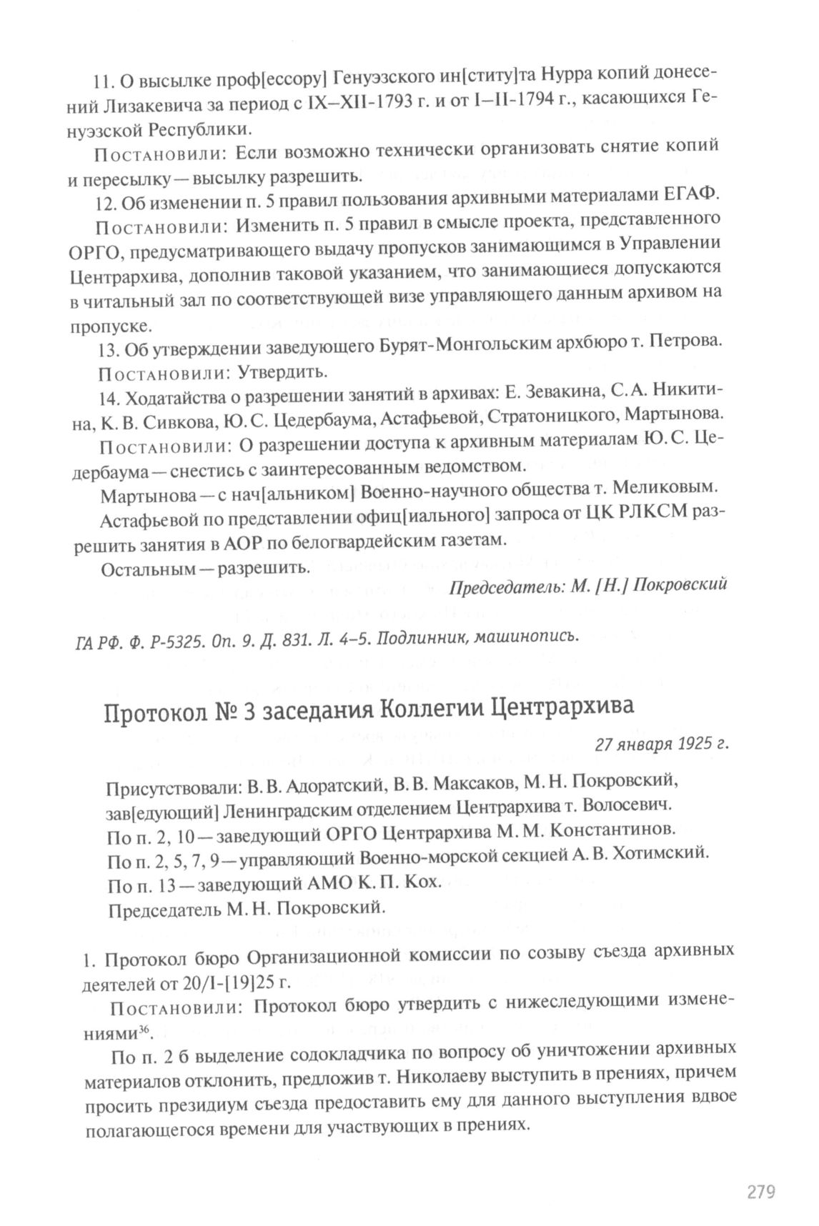 Протокол № 3 заседания Коллегии Центрархива РСФСР. 27 января 1925 г. // ГА РФ. Ф. P-5325. Oп. 9. Д. 831. Л. 6-7. Подлинник, машинопись.