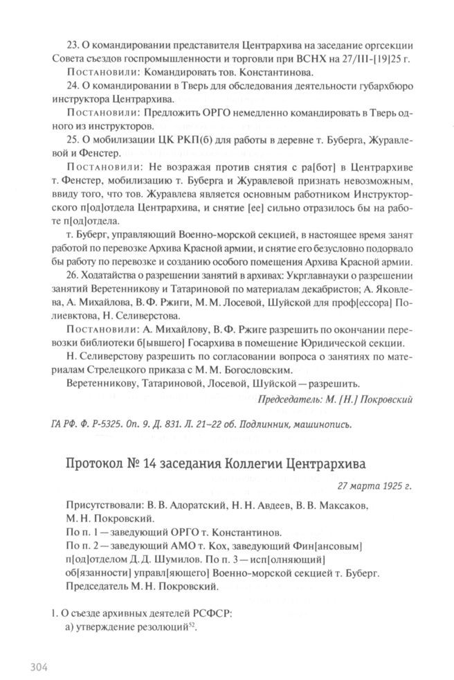 Протокол № 14 заседания Коллегии Центрархива РСФСР. 27 марта 1925 г. // ГА РФ. Ф. P-5325. Oп. 9. Д. 831. Л. 23-23 об. Подлинник, машинопись.