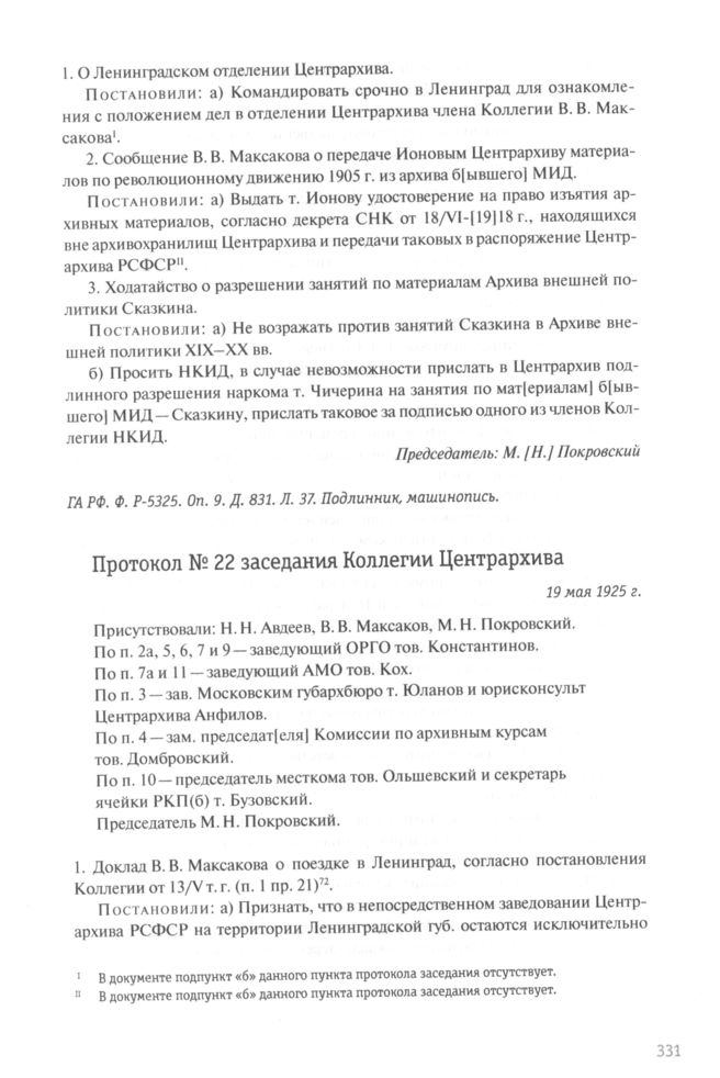Протокол № 22 заседания Коллегии Центрархива РСФСР. 19 мая 1925 г. // ГА РФ. Ф. P-5325. Oп. 9. Д. 831. Л. 38-39. Подлинник, машинопись.