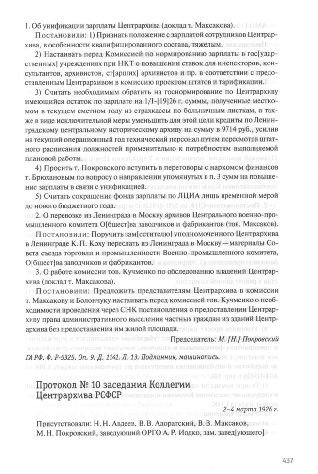 Протокол № 10 заседания Коллегии Центрархива РСФСР. 2-4 марта 1926 г.