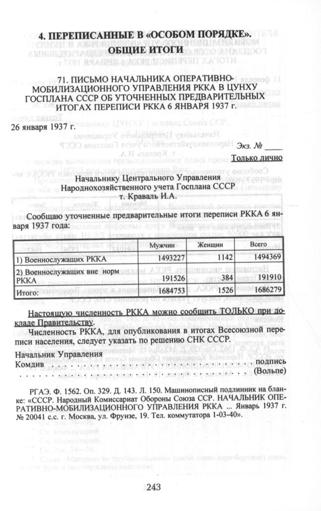 Письмо начальника оперативно-мобилизационного Управления РККА в ЦУНХУ Госплана СССР об уточненных предварительных итогах переписи РККА 6 января 1937 г. 26 января 1937 г. // РГАЭ. Ф. 1562. Оп. 329. Д. 143. Л. 150. Машинописный подлинник на бланке: «СССР. Народный Комиссариат Обороны Союза ССР. Начальник оперативно-мобилизационного управления РККА ... Январь 1937 г. № 20041 с.с. г. Москва, ул. Фрунзе, 19. Тел. коммутатора 1-03-40».