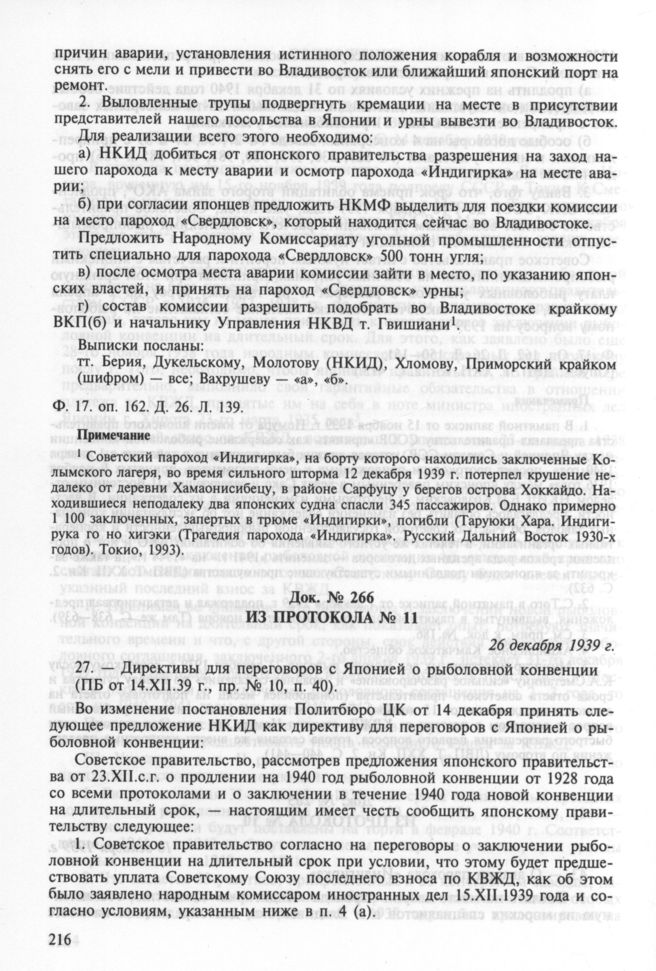 Из протокола № 11. Директивы для переговоров с Японией о рыболовной конвенции (ПБ от 14.XII.39 г., пр. № 10, п. 40). 26 декабря 1939 г. // РГАСПИ. Ф. 17. Оп. 162. Д. 26. Л. 154—155.