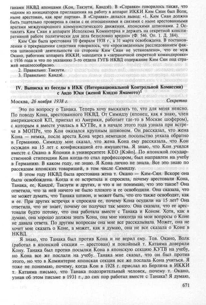 О «Деле Танака». IV. Выписка из беседы в ИКК (Интернациональной Контрольной Комиссии) с Андо Юки (женой Кэндзо Ямамото). Москва, 26 ноября 1938 г.