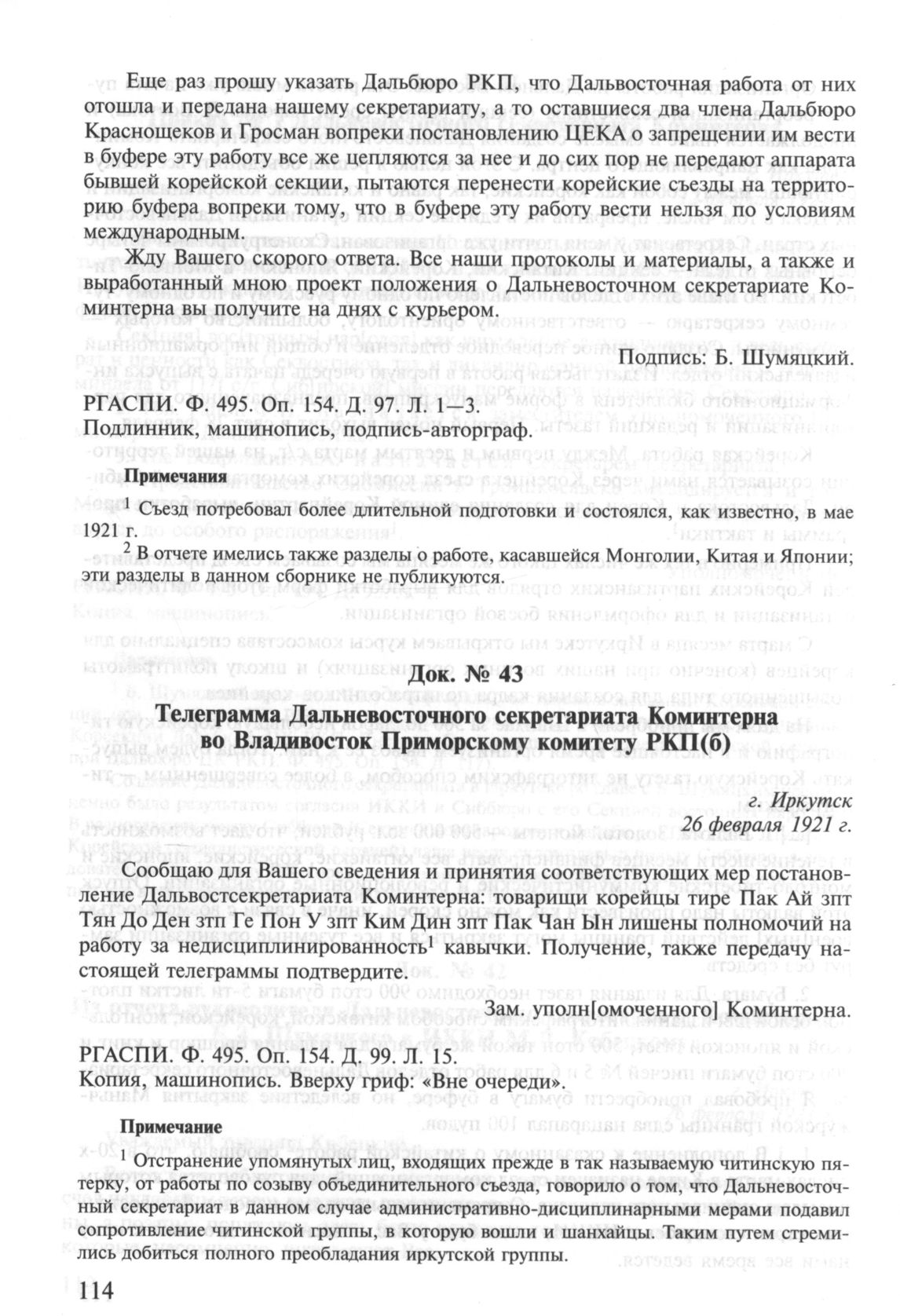 Телеграмма Дальневосточного секретариата Коминтерна во Владивосток Приморскому комитету РКП(б). 26 февраля 1921 г. // РГАСПИ. Ф. 495. Оп. 154. Д. 99. Л. 15. Копия, машинопись.