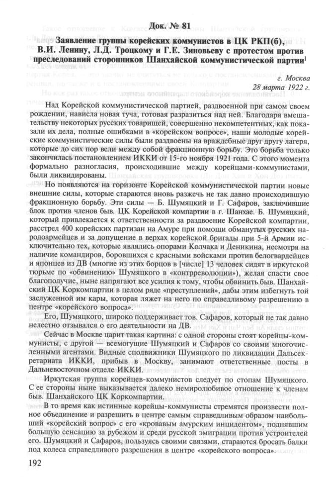 Заявление группы корейских коммунистов в ЦК РКП(б) В.И. Ленину, Л.Д. Троцкому и Г.Е. Зиновьеву с протестом против преследований сторонников Шанхайской коммунистической партии. 28 марта 1922 г. // РГАСПИ. Ф. 5. Оп. 2. Д. 143. Л. 8, 8 об., 9. Подлинник, машинопись, подписи-автографы.