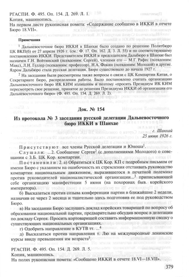 Из протокола № 3 заседания русской делегации Дальневосточного бюро ИККИ в Шанхае. 25 июня 1926 г. // РГАСПИ. Ф. 495. Оп. 154. Д. 269. Л. 5. Копия, машинопись.
