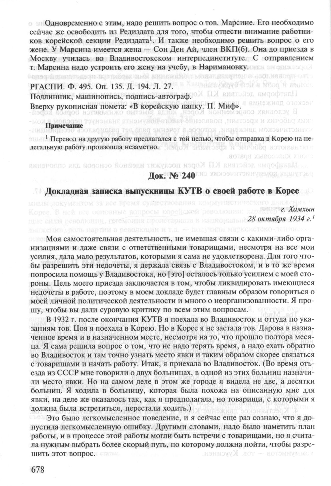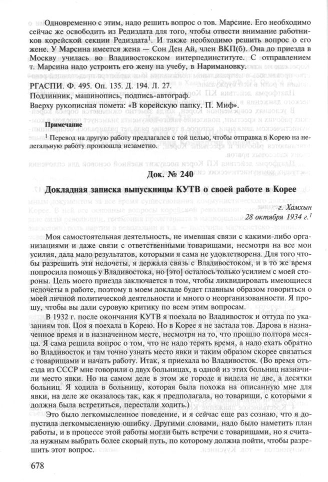Докладная записка выпускницы КУТВ о своей работе в Корее. 28 октября 1934 г. // РГАСПИ. Ф. 495. Оп. 135. Д. 194. Л. 28-44. Копия, машинопись.
