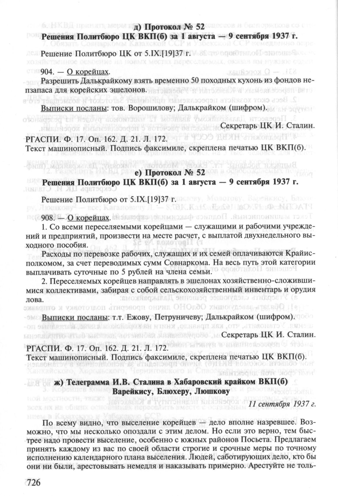Документы Политбюро ЦК ВКП(б) о переселении корейского населения из пограничных районов Дальнего Востока. Август 1937 — февраль 1938 г. д) Протокол № 52. Решения Политбюро ЦК ВКП(б) за 1 августа — 9 сентября 1937 г. Решение Политбюро ЦК от 5.IX.[19]37 г. // РГАСПИ. Ф. 17. Оп. 162. Д. 21. Л. 172. Текст машинописный. Подпись факсимиле, скреплена печатью ЦК ВКП(б).