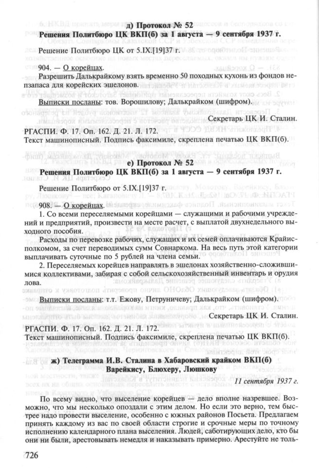 Документы Политбюро ЦК ВКП(б) о переселении корейского населения из пограничных районов Дальнего Востока. Август 1937 — февраль 1938 г. е) Протокол № 52. Решения Политбюро ЦК ВКП(б) за 1 августа — 9 сентября 1937 г. Решение Политбюро от 5.IХ.[19]37 г. // РГАСПИ. Ф. 17. Оп. 162. Д. 21. Л. 172. Текст машинописный. Подпись факсимиле, скреплена печатью ЦК ВКП(б).