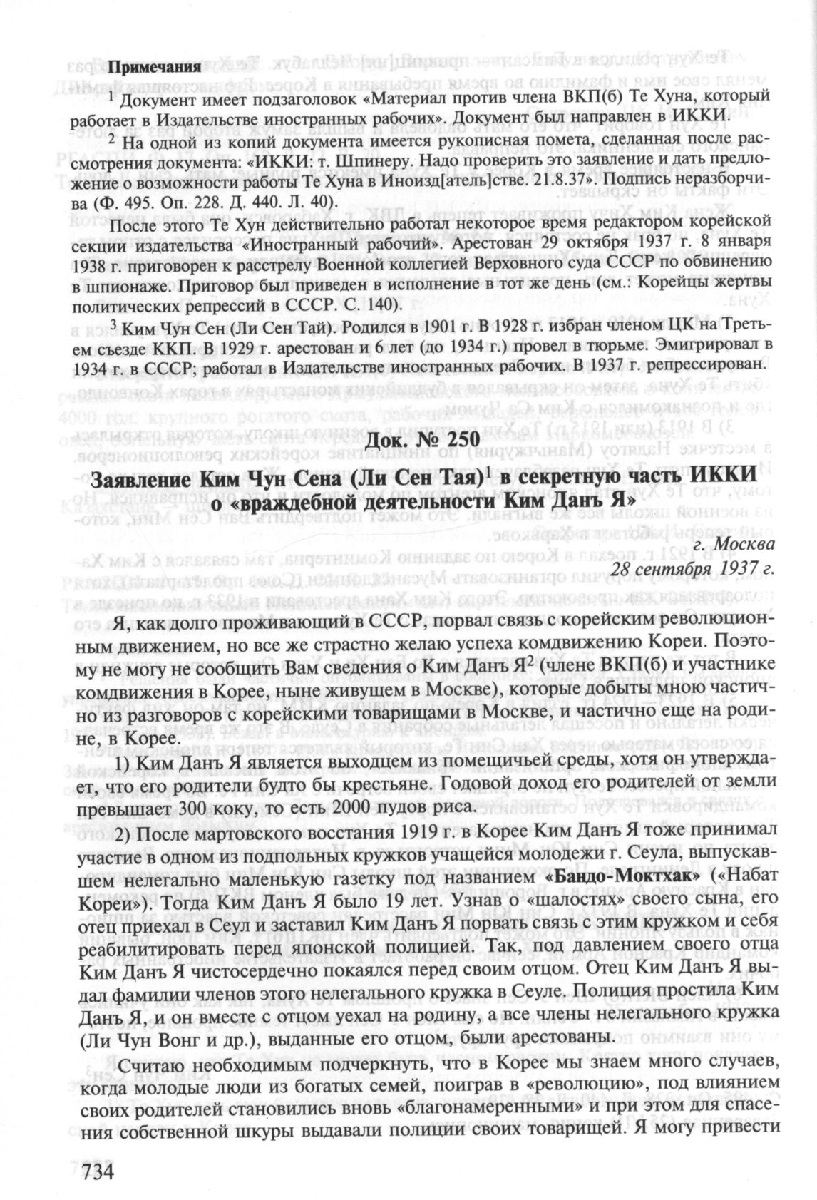 Заявление Ким Чун Сена (Ли Сен Тая) в секретную часть ИККИ о «враждебной деятельности Ким Дань Я». 28 сентября 1937 г. // РГАСПИ. Ф. 495. Оп. 228. Д. 439. Л. 90—90 об., 91—91 об., 92. Подлинник, машинопись, подпись-автограф.