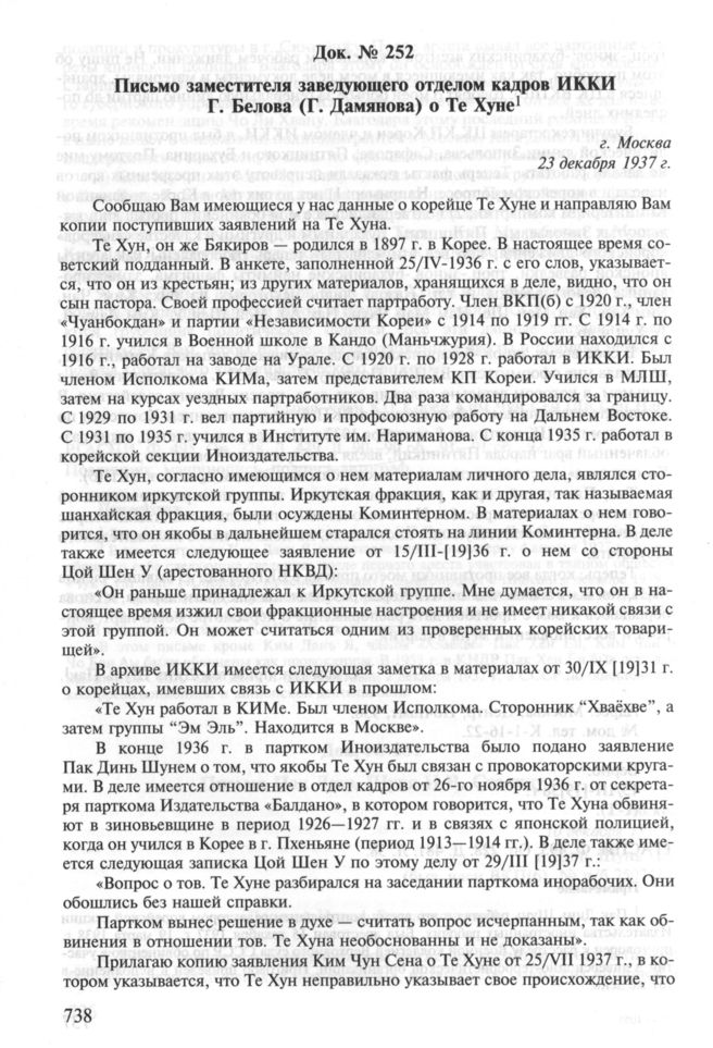 Письмо заместителя заведующего отделом кадров ИККИ Г. Белова (Г. Дамянова) о Те Хуне. 23 декабря 1937 г. // РГАСПИ. Ф. 495. Оп. 228. Д. 440. Л. 34, 35.