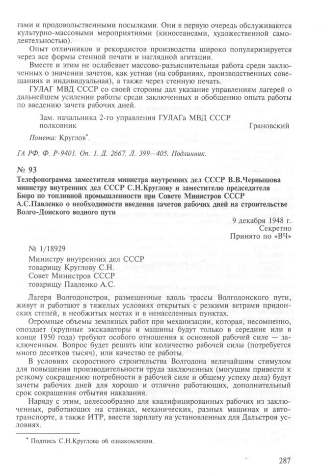 Телефонограмма заместителя министра внутренних дел СССР В.В.Чернышова министру внутренних дел СССР С.Н.Круглову и заместителю председателя Бюро по топливной промышленности при Совете Министров СССР А.С.Павленко о необходимости введения зачетов рабочих дней на строительстве Волго-Донского водного пути. 9 декабря 1948 г. // ГА РФ. Ф. P-5446. Оп. 50а. Д. 3900. Л. 9—10. Заверенная копия.