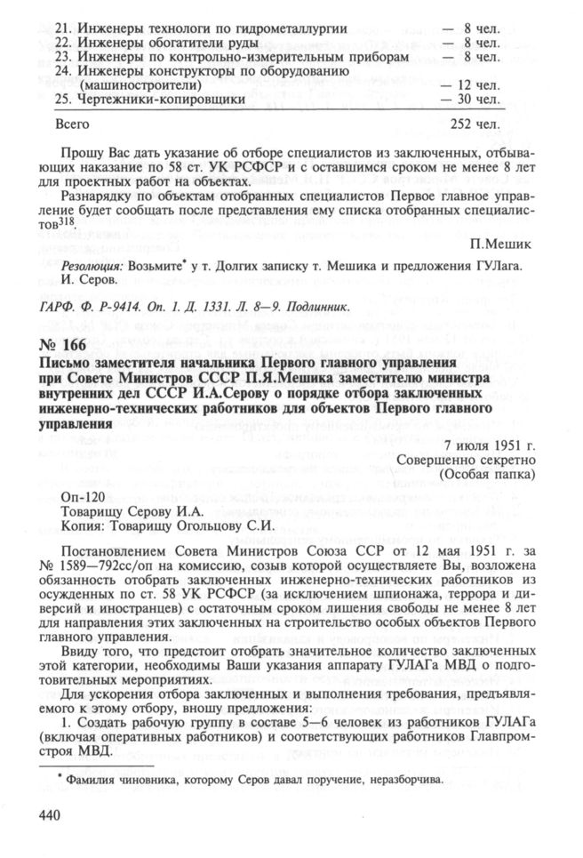Письмо заместителя начальника Первого главного управления при Совете Министров СССР П.Я.Мешика заместителю министра внутренних дел СССР И.А.Серову о порядке отбора заключенных инженерно-технических работников для объектов Первого главного управления. 7 июля 1951 г. // ГА РФ. Ф. P-9414. Оп. 1. Д. 1331. Л. 14—15. Подлинник