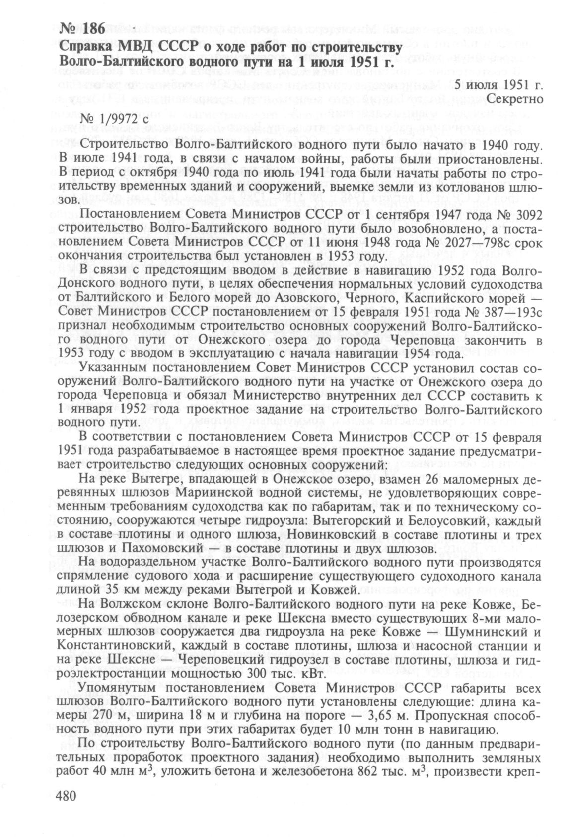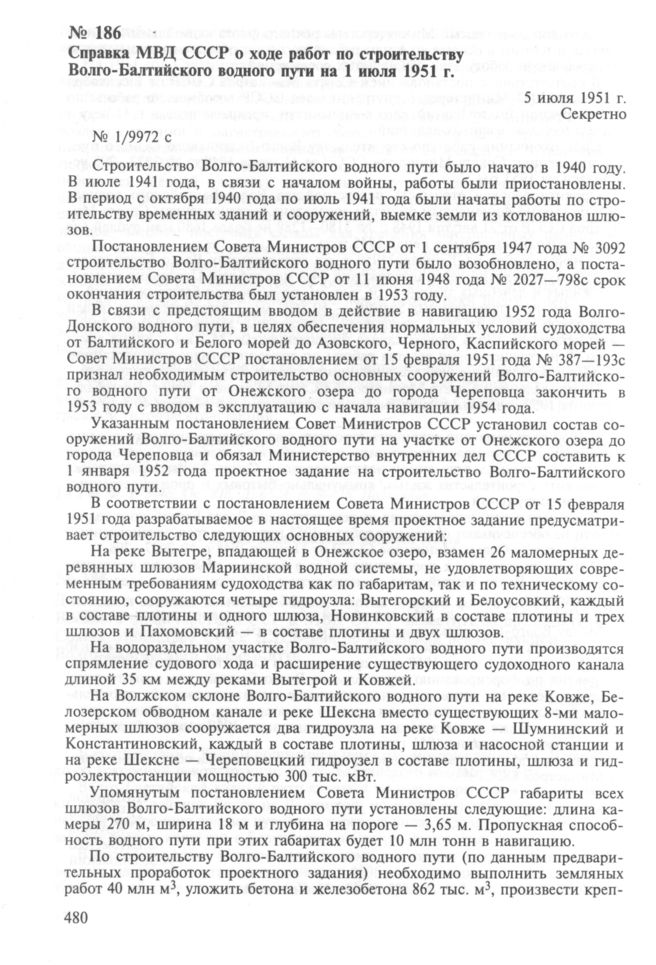 Справка МВД СССР о ходе работ по строительству Волго-Балтийского водного пути на 1 июля 1951 г. 5 июля 1951 г. // ГА РФ. Ф. P-5446. Оп. 816. Д. 6645. Л. 36—40. Подлинник.
