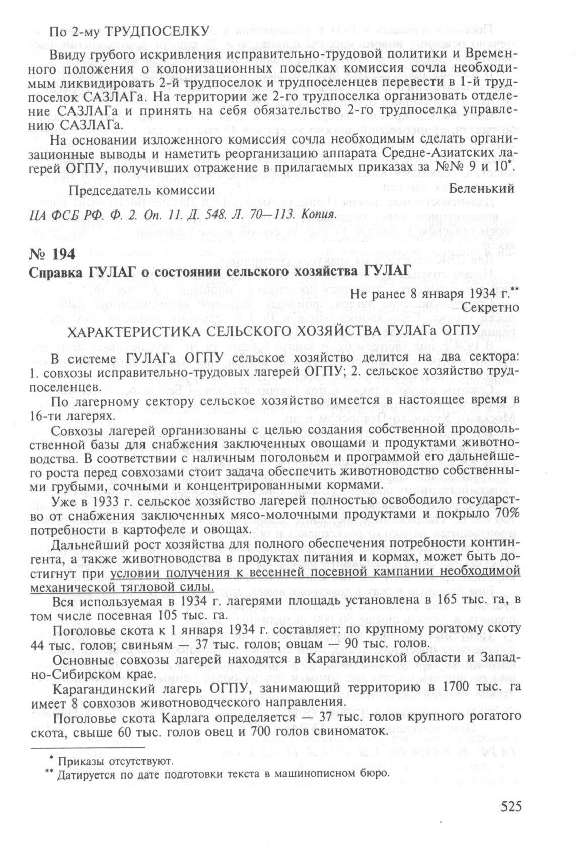 Справка ГУЛАГ о состоянии сельского хозяйства ГУЛАГ. Не ранее 8 января 1934 г. // ГА РФ. Ф. P-9414. Оп. 1. Д. 1913. Л. 12—13. Копия.