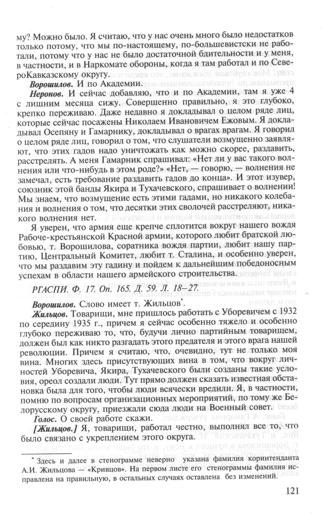 Стенограмма заседания Военного совета при наркоме обороны СССР 1—4 июня 1937 г. Утреннее заседание Военного совета 2 июня 1937 г. Жильцов А.И. // РГАСПИ. Ф. 17. Оп. 165. Д. 59. Л. 28-37.
