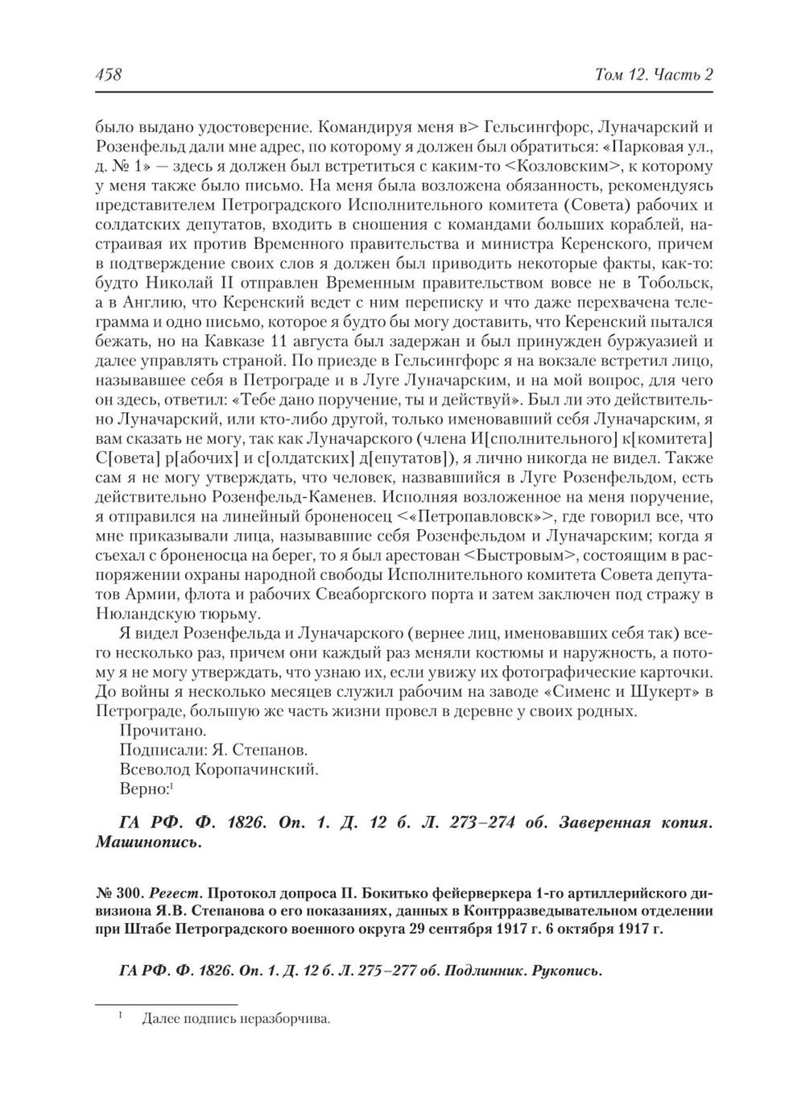 Регест. Протокол допроса П. Бокитько фейерверкера 1-го артиллерийского дивизиона Я. В. Степанова о его показаниях, данных в Контрразведывательном отделении при Штабе Петроградского военного округа 29 сентября 1917 г. 6 октября 1917 г. // ГА РФ. Ф. 1826. Оп. 1. Д. 12 б. Л. 275–277 об. Подлинник. Рукопись.