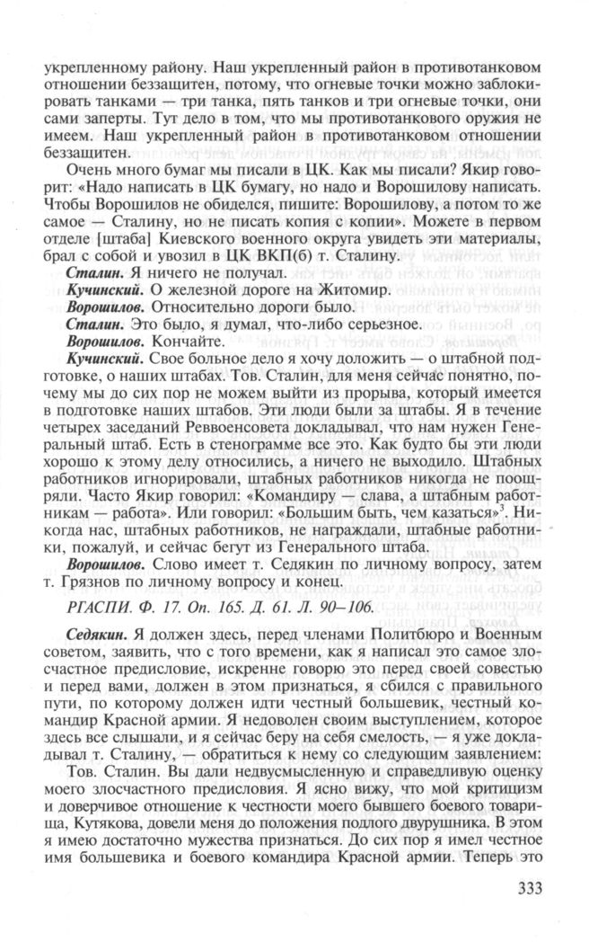 Стенограмма заседания Военного совета при наркоме обороны СССР 1—4 июня 1937 г. Утреннее заседание 4 июня 1937 г. Седякин А.И. // РГАСПИ. Ф. 17. Оп. 165. Д. 61. Л. 107-108.